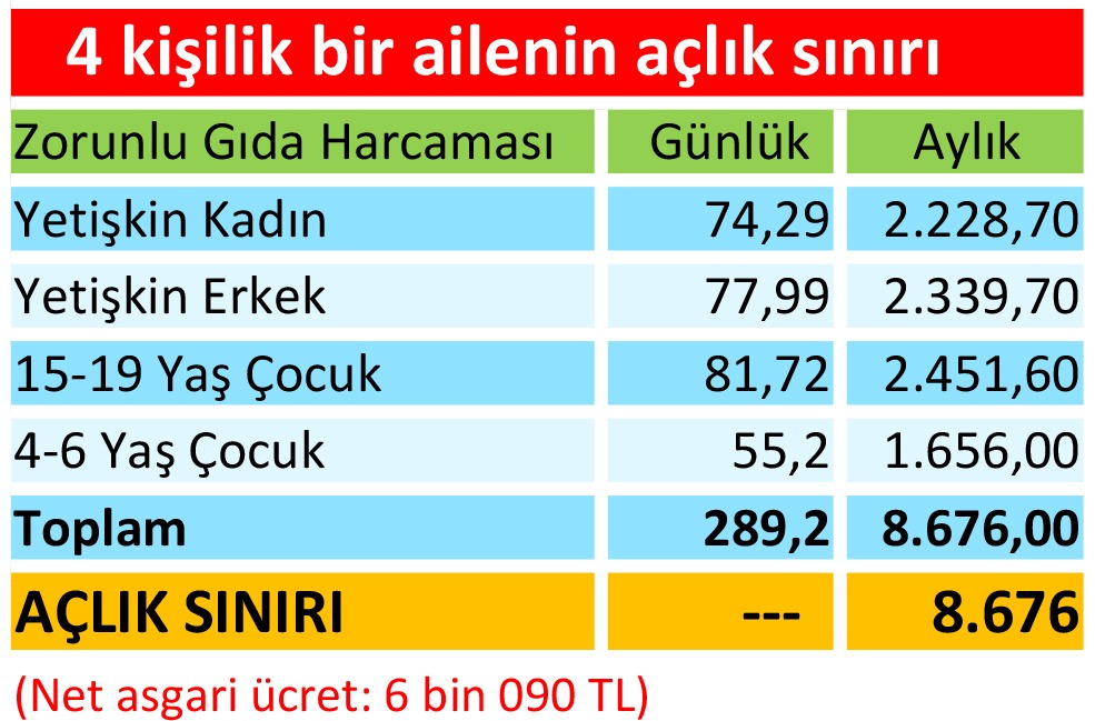 Yayınlanan bildiriye göre, Yataklı Tedavi Kurumları Dairesi’nden alınan 4 kişilik bir ailenin sağlıklı bir biçimde beslenmesi için gerekli olan beslenme kalıbı ve bu kalıptaki maddelerin İstatistik Kurumu’nca sendikaya gönderilen fiyatların ortalamaları alınarak hazırladıkları rapora göre, 4 kişilik bir aile için açlık sınırının 8 bin 676 TL olarak hesaplandı.