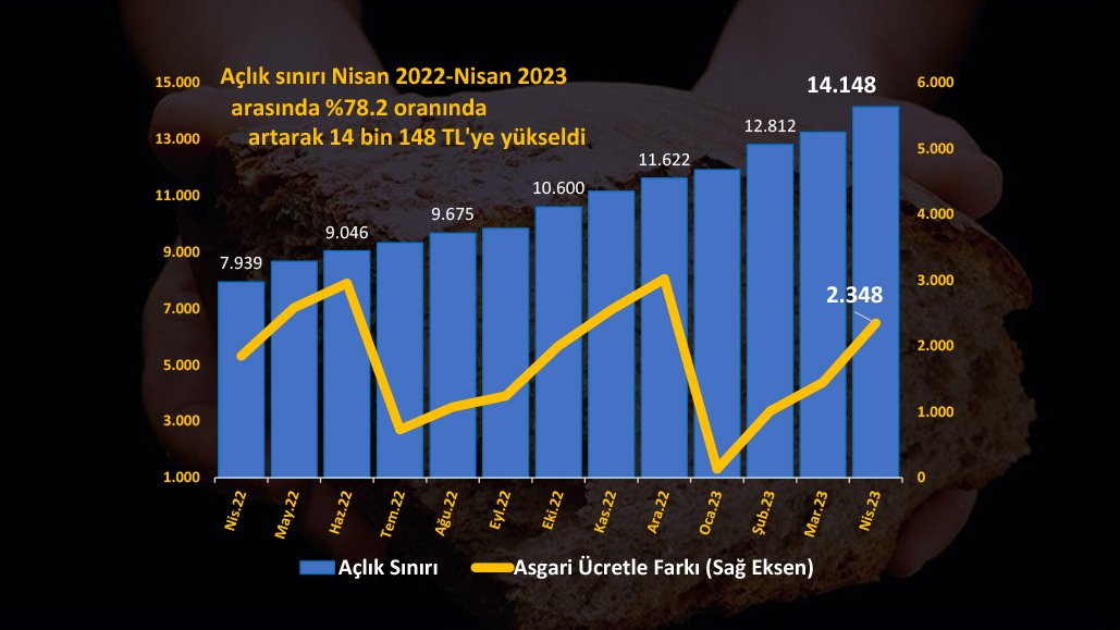 Nisan sonu itibarıyla açlık sınırı 14 bin 148 TL’ye ulaşarak, asgari ücreti 2 bin 348 TL’yi aştı.