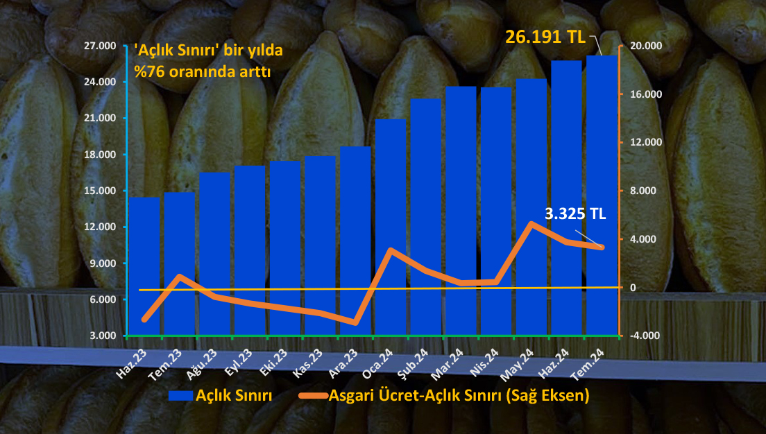 Asgari ücretle açlık sınırı arasındaki farkın her geçen ay daha da azaldığına dikkati çeken sendikal çevreler, haneye tek asgari ücretin girdiği ailelerin, gıda harcamaları haricindeki diğer zorunlu harcamaları yapmaları için ellerinde sadece 3 bin 325 TL kaldığına işaret ediyor. Sendikal çevreler, bu miktarın; ailelerin yarı aç, yarı tok yaşadığını gösterdiğini savunuyor.