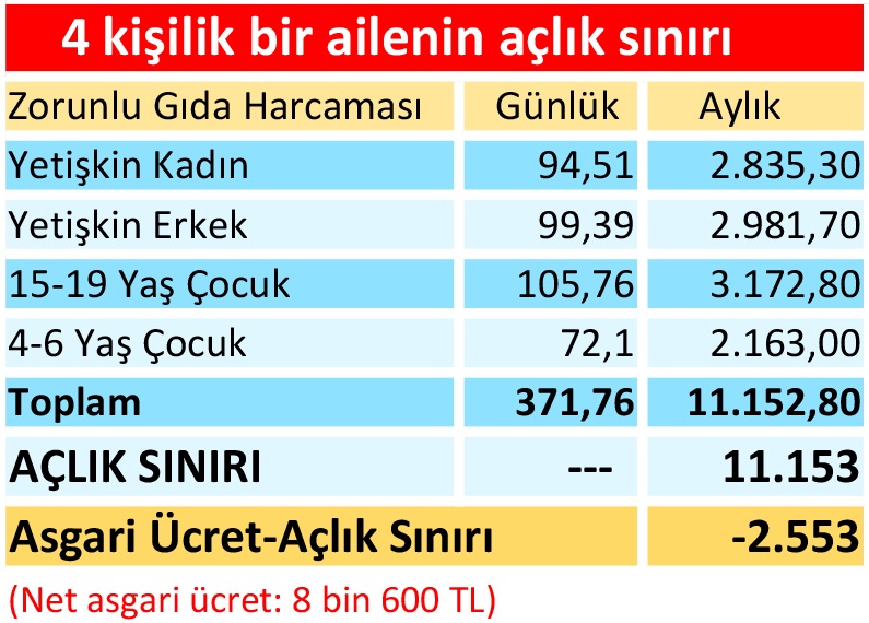 Kasım ayı itibariyle 4 kişilik bir ailenin açlık sınırı 11,153 TL’ye çıktı