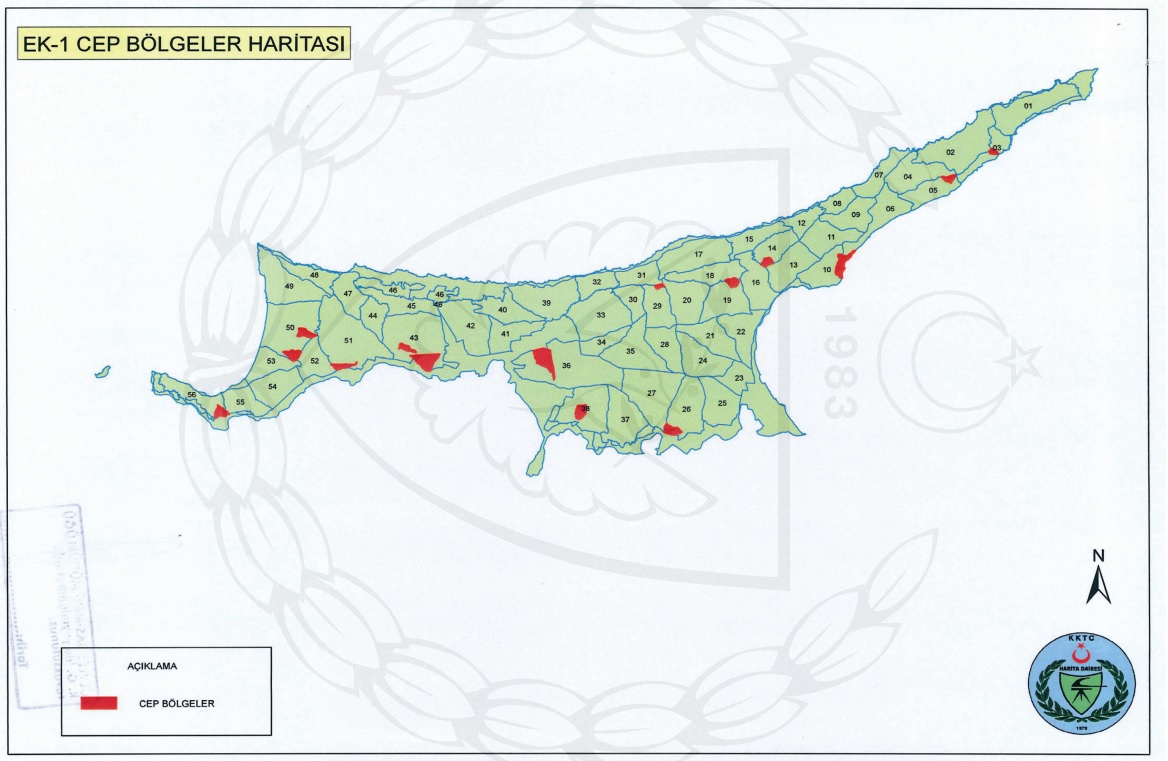 11.) 43 nolu av bölgesi içerisinde kalan, Güzelyurt- Lefkoşa ana yolunda Türkeli ve Alayköy çemberi arasındaki asfalt yolun kuzeyinde kalan, Akdağ diye bilinen tepenin, tepeyi bütün olarak içine alıp etrafını dönen toprak yolun içinde kalan bölge cep bölge ilan edilmiştir.