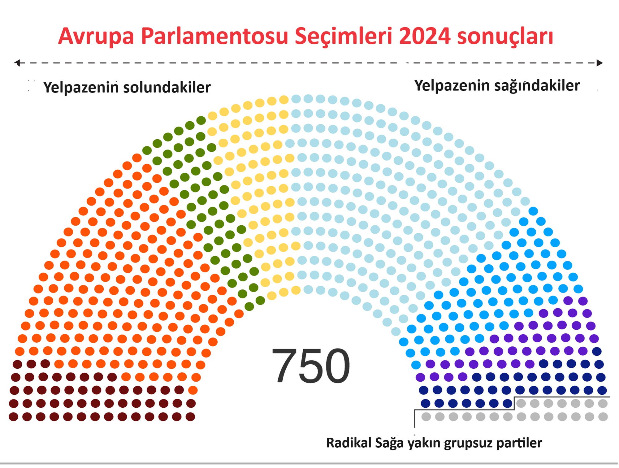 Avrupa Parlamentosu (AP) seçimleri kıta politikasında sarsıntıya sebep oldu. Birçok büyük ülkede aşırı sağın ciddi kazanımlar elde ettiği seçimlerin ilk ve en çarpıcı sonuçlarından biri Fransa’da erken seçim kararı oldu. Avrupa Birliği üyesi 27 ülkede, 720 sandalyeli Avrupa Parlamentosu için 6-9 Haziran tarihleri arasında seçimler düzenlendi. Seçimlerde aşırı sağın yükselişi en çok dikkat çeken unsur oldu. AP tarafından dün açıklanan geçici sonuçlara göre merkez-sağdaki Avrupa Halk Partisi (EPP) en büyük grup olarak kaldı. Merkez-soldaki Sosyalistler ve Demokratlar İlerici İttifakı (S&D) da ikinciliğini korudu.
