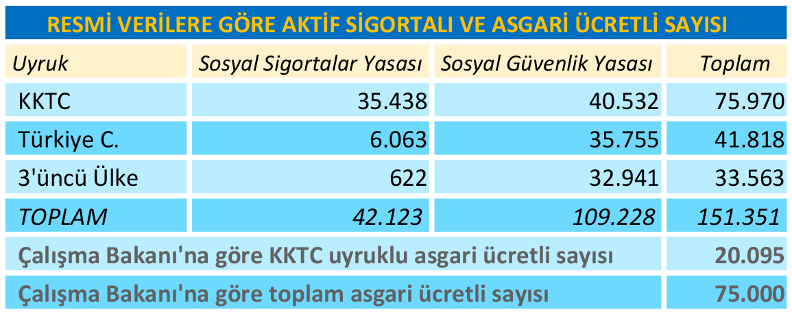 Çalışma ve Sosyal Güvenlik Bakanlığı’nın Meclis’te açıklanan verilerine göre aktif sigortalı çalışan sayısı 151 bin 351 kişi düzeyinde. Bu rakamın 75 bin 381’i “yabancı uyruklu” (41 bin 818 TC uyruklu, 33 bin 563 3’ncü ülke uyruklu), 75 bin 970’i ise KKTC uyruklu sigortalı. Bakan Gardiyanoğlu’nun “75 bin” açıklaması, “tüm kayıtlı çalışanların” %49.7’sinin minimum ücretle geçinmeye çalıştığına işaret ediyor. Aynı şekilde asgari ücretlilerin %27’sinin de KKTC uyruklu, %73’ünün ise TC ve 3’üncü ülke uyruklu olduğu görülüyor.