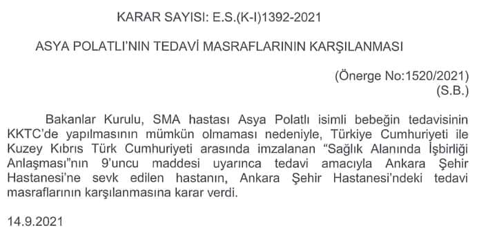 Bugün alınan Bakanlar Kurulu kararına göre, Asya bebeğin Ankara’daki tedavi masrafları hükümet tarafından ödenecek.