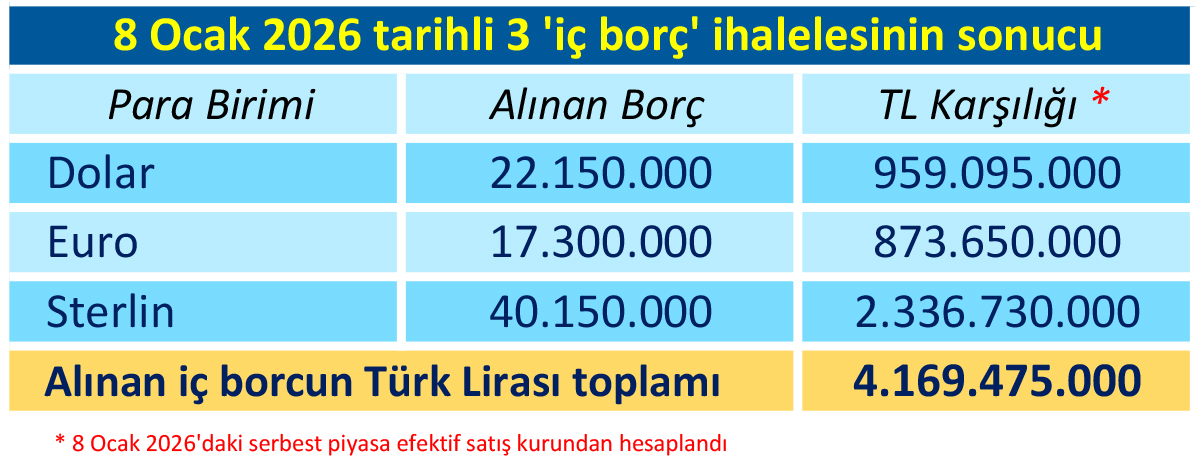 Bu arada, Bakanlar Kurulu 7 Ocak 2026 tarihli Resmi Gazete’de yayımlanan bir kararla, devletin mali yükümlülüklerinin yerine getirilebilmesine olanak sağlamak amacıyla Maliye Bakanlığı’na “2026 Mali Yılı Bütçe Yasası limitleri dahilinde 6 milyar TL borçlanma yetkisi” verdi. Kabine 2025’te de aynı kararı üretmişti. Merkez Bankası verilerine göre, 11 Şubat-25 Aralık 2025 tarihleri arasında Maliye için açılan ve sonuçlandırılan 39 iç borç ihalesindeki borçlanma, 33 milyar 961 milyon lirayı geçmişti. 8 Ocak 2026 itibarıyla (yeni borçlar hariç) iç borç stoku 4,2 milyar TL; 97,1 milyon dolar; 55,5 milyon Sterlin ve 36,8 milyon Euro düzeyinde saptandı.