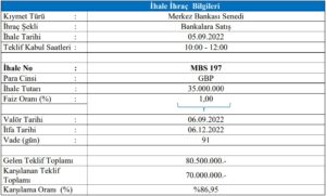 “Merkez Bankası Senetleri İhalelerine Katılım Esasları çerçevesinde, 05 Eylül 2022 günü Merkez Bankası Senetlerinin ‘yeniden ihracının’ gerçekleştirileceği” açıklanan ihalede, teklif kabulleri 10.00-12.00 saatleri arasında yapıldı.