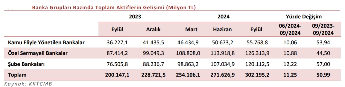KKTC Merkez Bankası verilerine göre, Eylül 2024 sonu itibarıyla bankacılık sektörünün aktif büyüklüğü, Eylül 2023’e göre %50.99 oranında artarak, 302 milyar 194 milyon TL’ye ulaştı. Eylül 2023’te aktif büyüklük 200 milyar 147 milyon TL idi. 2023 yılını 228,7 milyar TL ile kapatan konsolide bilanço, 2024’ün ilk çeyreği sonunda %11.1 artışla 254,1 milyar TL’ye; ikinci çeyrekte %6.9 artışla 271,6 milyar TL’ye; 3’ncü çeyrekte de %11.3 artışla 302,1 milyar TL’ye çıktı. 2024 yılının dokuz aylık dönemindeki artış oranı ise %32.2 düzeyinde hesaplandı.