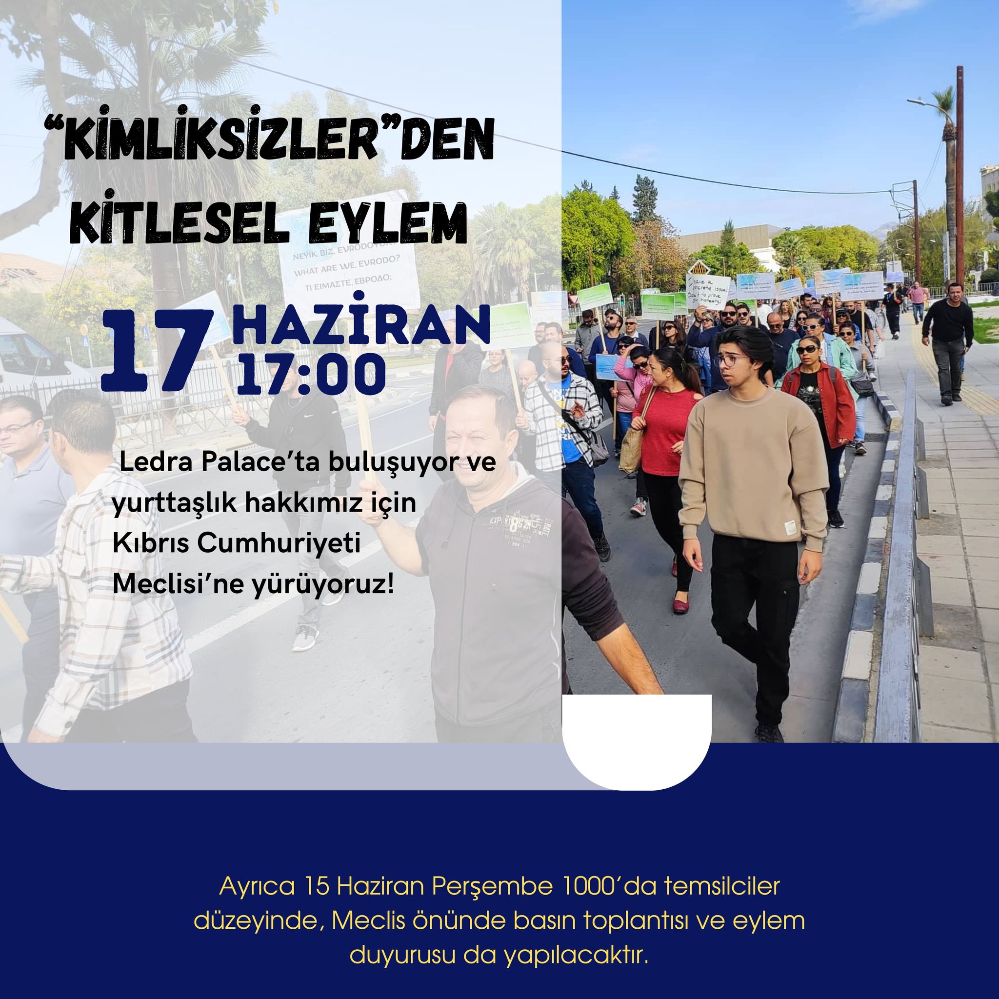 “Kıbrıs Cumhuriyeti” vatandaşlarının çocuklarının eşit yurttaşlık hakkını savunan Kimliksizler Derneği, 17 Haziran Cumartesi günü saat 17.00’de Ledra Palace’tan başlayarak Rum Meclisi’ne yürüyecek.