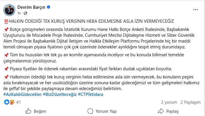 Barçın, sosyal medya hesabından yaptığı açıklamada, İstatistik Kurumu’nun Hane Halkı Bütçe Anketi ihalesi, Başbakanlık Uyuşturucu ile Mücadele Projesi ihalesi, Cumhuriyet Meclisi’nin dijitalleşme ve siber güvenlik hizmeti alımı ile Başbakanlık Dijital İletişim ve Halkla Etkileşim Platformu Projesi için ayrılan kaynaklarda ciddi tutarsızlıklar olduğunu ifade etti.