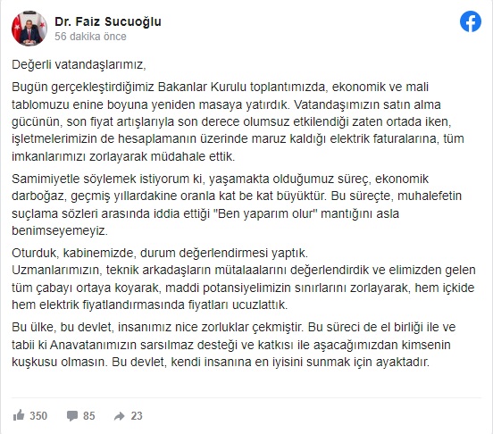 “Vatandaşımızın satın alma gücünün, son fiyat artışlarıyla son derece olumsuz etkilendiği zaten ortada iken, işletmelerimizin de hesaplamanın üzerinde maruz kaldığı elektrik faturalarına, tüm imkanlarımızı zorlayarak müdahale ettik”