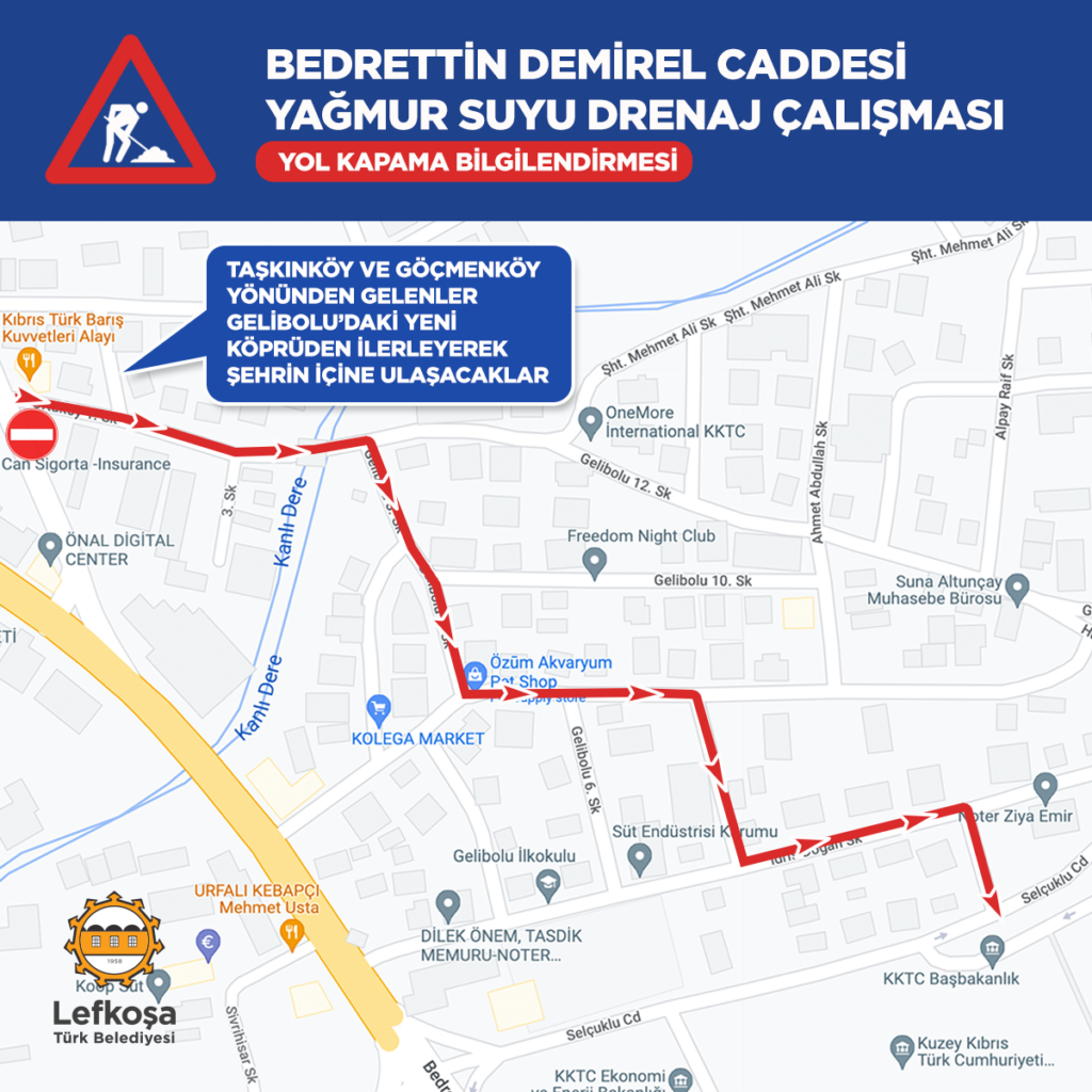 Çalışmalar boyunca trafik düzenlemesi şu şekildedir: Taşkınköy ve Göçmenköy bölgesinden Başbakanlığa doğru gelişte, Gelibolu bölgesindeki yeni köprümüze yönlendirme yapacağız. Yurttaşlarımız böylece Gelibolu bölgesi üzerinden şehrin içerisinde ulaşabilecekler.