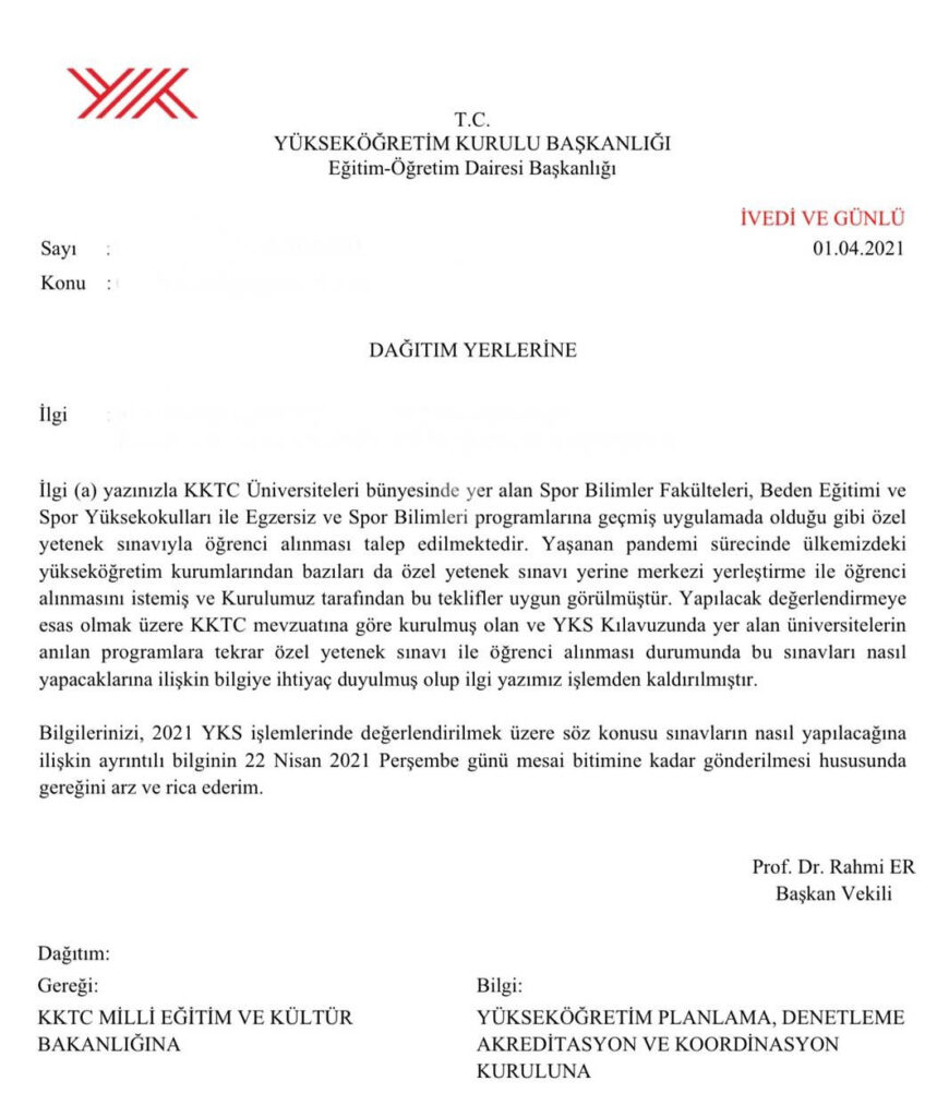 Yükseköğretimde ülkemiz ile ilgili önemli gelişmeler yaşanırken bir sevindirici bir de üzücü bir haber gelişmesi yaşandı. Türkiye milli takımlarında yer alan ülkemiz sporcularının da faydalanabileceği “Türk Sporuna Yükseköğretimde Yüzde Yüz Destek” programına KKTC’deki 17 üniversite de dahil olurken YÖK’ün ülkemizdeki Spor Bilimleri Fakülteleri’ne özel yetenek sınavı ile öğrenci alınmasını kaldırıp eşit ağırlık ile öğrenci alınabileceği kararı ise bu alandaki bölümleri oldukça zor durumda bıraktı.