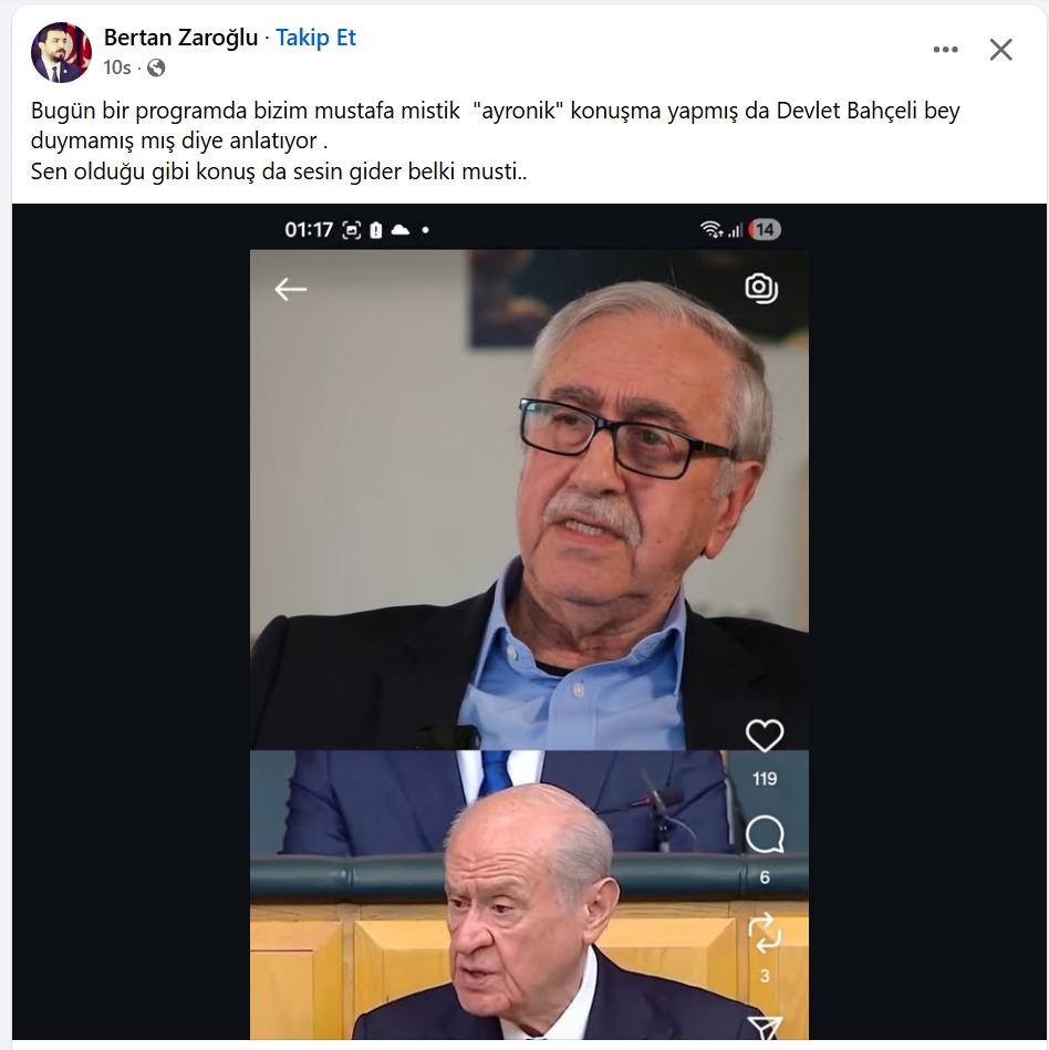 YDP eski Milletvekili Bertan Zaroğlu’nun sosyal medya paylaşımı okuyanları şaşkına çevirdi. Zaroğlu, Dördüncü Cumhurbaşkanı Mustafa Akıncı’dan “Mustafa Mıstık” ve “Musti” diye söz etti.