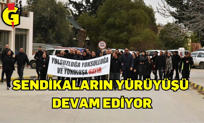 Taşkınköy Şefler Pastanesi önünde toplanan Kıbrıs Türk Amme Memurları Sendikası (KTAMS), Kıbrıs Türk Kamu Görevlileri Sendikası (KAMUSEN), Kamu İşçileri Sendikası (KAMU-İŞ), Kıbrıs Türk Öğretmenler Sendikası (KTÖS) ve Kıbrıs Türk Orta Eğitim Öğretmenler Sendikası (KTOEÖS) yetkilileri, Bayındırlık ve Ulaştırma Bakanlığı önüne yürüdü.