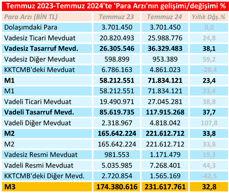 KKTC ekonomisinde kullanılabilecek toplam para miktarını gösteren ‘Para Arzı’ (M3), Temmuz 2024 sonunda 231 milyar 618 milyon TL düzeyinde saptandı. KKTC Merkez Bankası verilerine göre 2023 yılı sonunda ilk kez 200 milyar TL’yi aşan M3, yedi ayda %16’ya yakın artış yaşadı. Para arzındaki yıllık artış ise 57,2 milyar TL (%33) civarında gerçekleşti. M3 Temmuz 2023’te 174 milyar 380 milyon TL olarak hesaplanmıştı. Geçtiğimiz Haziran ayı sonunda 229,2 milyar TL olan para arzının bir ayda 2,4 milyar TL (%1.04) arttığı da kayıtlara geçti.