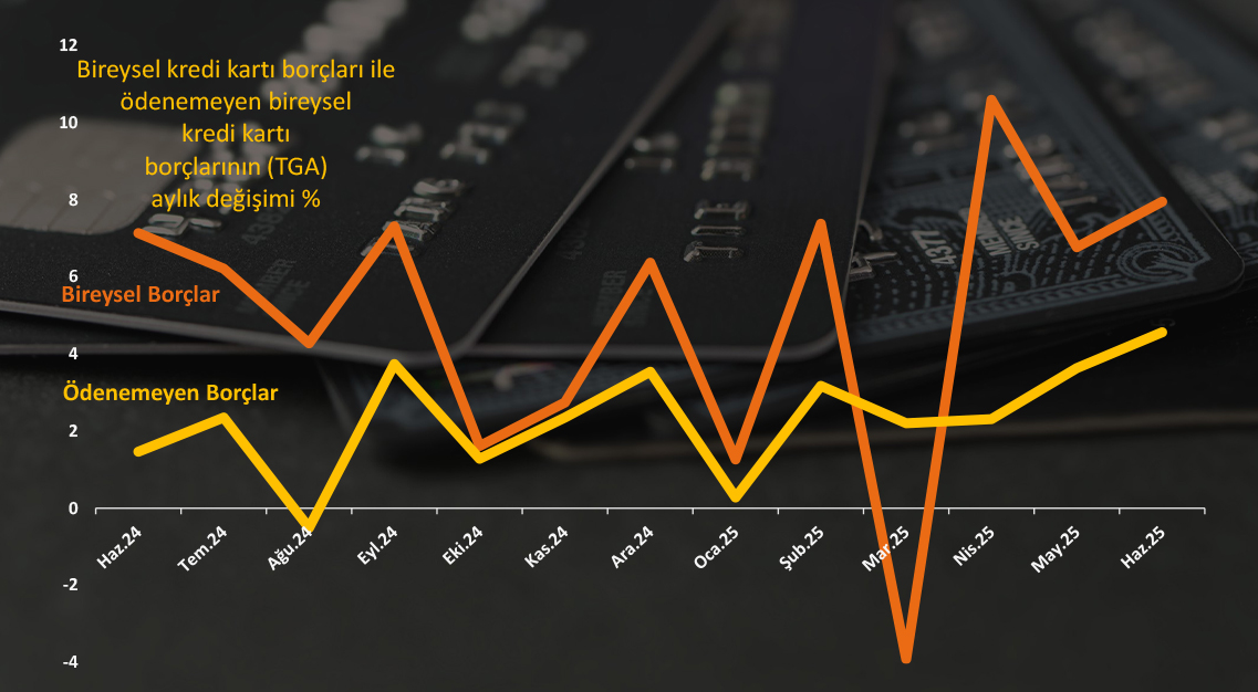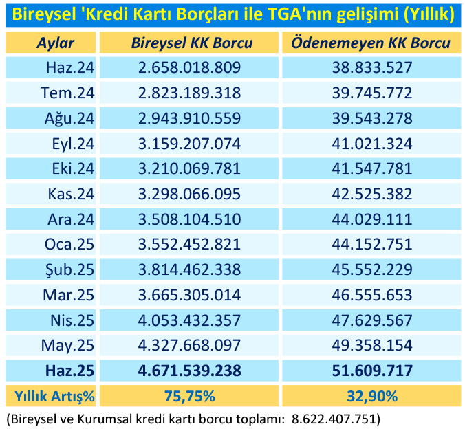 KKTC Merkez Bankası verilerine göre, bireysel (vatandaşın) kredi kartı borcu Haziran 2024 ile Haziran 2025 arasındaki yılık dönemde %75.75 oranında; Aralık sonundan Haziran sonuna kadarki altı aylık sürede ise %25 oranında büyüdü. Bireysel kredi kartı borçları Haziran 2024’te 2 milyar 658 milyon lira, Aralık 2024’te de 3 milyar 508 milyon TL düzeyindeydi. Haziran 2025 sonundaki 4,7 milyarlık kredi kartı borcu; TL’nin değer kayıpları ile yüksek enflasyonun da etkisiyle tüm zamanların en yüksek seviyesi rekorunu yeniledi.