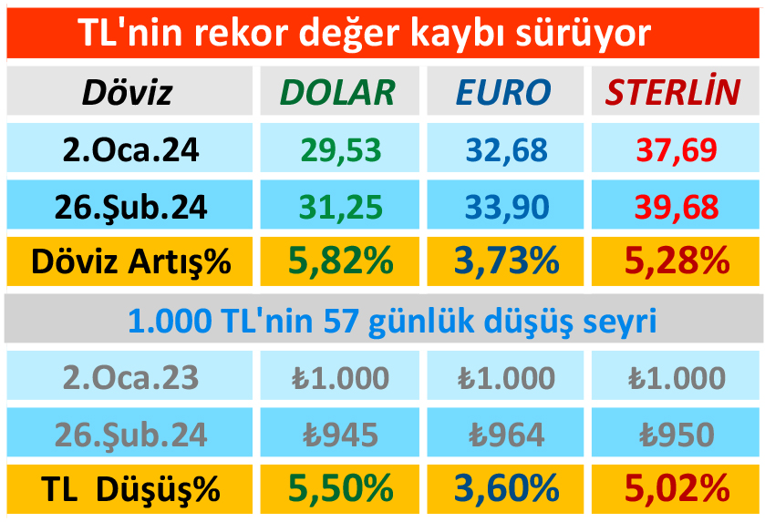 Bu arada, TL vatandaşın korkulu rüyası olmaya devam ederken, alım gücü de günden güne eriyor. GIYNIK Ekonomi olarak yaptığımız hesaplamada yılbaşındaki “1.000” TL’nin değerinin, 26 Şubat itibarıyla dolar karşısında 945 TL’ye kadar indiği ortaya çıktı. Başka deyişle Dolar/TL 57 günde %5.5 değer kazandı. Aynı şekilde 1.000 TL; Euro karşısında 9964 TL’ye, sterlin karşısında da 950 TL’ye geriledi.