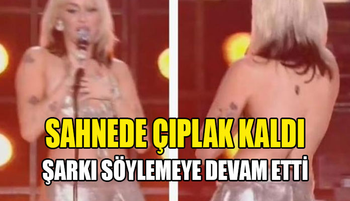 Amerikalı şarkıcı Miley Cyrus, Amerika NBC televizyonunda canlı yayınlanan programda sahnede şarkı söylerken, bluzu üzerinden düşünce üst kısmı tamamen çıplak kaldı.