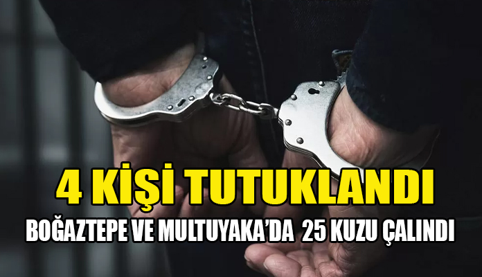 Polis Basın Subaylığından yapılan yazılı açıklamada, 14-22 Haziran tarihleri arasında, Boğaztepe’de Hasan ve Emine Monargalı’ya ait ağıl içerisinden beş adet kuzu ve Mutluyaka’da Burhan Dirensoy’a ait ağıl içerisinden de toplam 20 adet kuzunun çalınması ile ilgili olarak yürütülen ileri soruşturmada meselede zanlı olarak görülen Ü.Y. (E-36) ve olayla bağlantısı olduğu tespit edilen A.A.(E-50), O.D.(E-39) ve N.K.’nin (E-40) tutuklandığı kaydedildi.