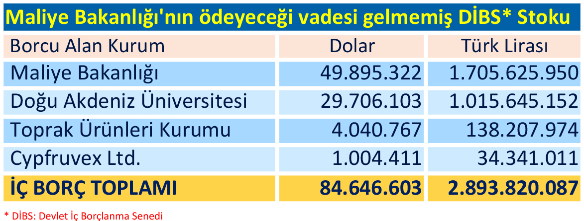 Maliye Bakanlığı bütçedeki açıkları kapatmak için yeni bir borçlanmaya daha gitti. Geçtiğimiz hafta Bakanlar Kurulu’ndan 1 milyar TL borçlanma yetkisi alan Maliye, 30 Ekim’de sonuçlanan Devlet İç Borçlanma İhalesi’nde (DİBS) 24,9 milyon dolar (852 milyon TL) temin etti. Geçen hafta Maliye ayrıca, Doğu Akdeniz Üniversitesi için 3,5 milyon dolarlık (122,6 milyon TL) yeni bir borca imza attı. Yeni borçlanmalarla birlikte Maliye’nin vadesi gelmeyen iç borç stoku 335 milyon TL (9,7 milyon dolar) dahil 84 milyon 646 bin dolara (2 milyar 894 milyon TL) ulaştı.