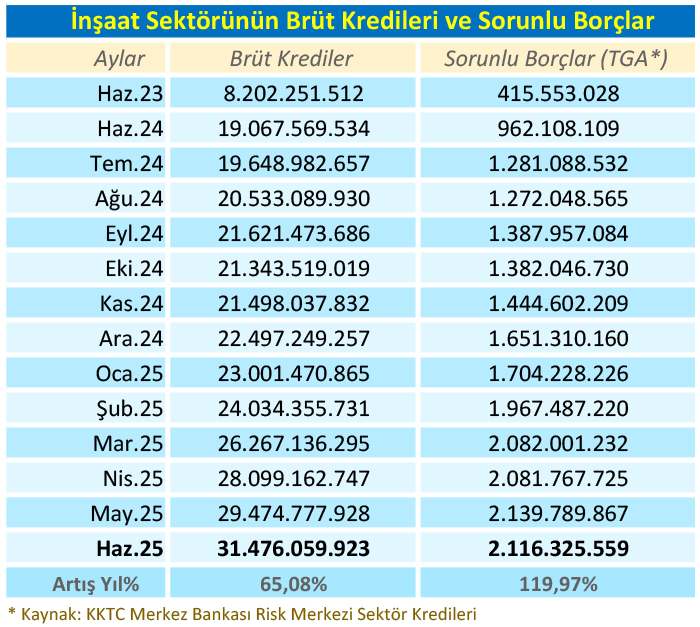 Bankaların, KKTC Merkez Bankası Risk Merkezi’ne yaptığı zorunlu bildirimlere göre, inşaat sektörünün kullandığı krediler ile TGA 24 aydır hız kesmeden artıyor. Risk Merkezi verileri, inşaat sektörünün; tüm sektörlerin kullandığı toplam kredinin (140,2 milyar lira), %22.5’lik kısmına sahip olduğuna işaret ediyor. Ancak, inşaatın sektörlerin ödenemeyen toplam borçlardaki payı daha yüksek. Sektör kredilerinin yaklaşık %5.93’üne denk gelen 8 milyar 313 milyon liralık kısmını sorunlu borçlar oluştururken, inşaat tahsili gecikmiş alacaklar toplamının %25.46’yı aşan bir kısmını elinde bulunduruyor. Başka deyişle, inşaatın 2 milyar 117 milyon lira düzeyinde açıklanan sıkıntılı kredi borçları, tüm TGA’nın dörtte birinden daha fazla.