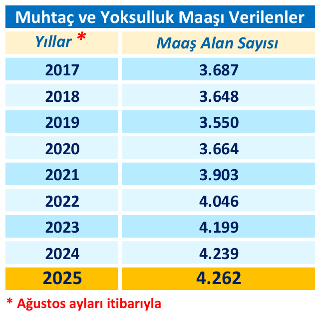 Resmi verilere göre, 96 aylık dönemde “Destek verilenler” toplamı da %19.2 oranında artarak 10 bin 701’e çıktı. Bu yükselişin bir nedeni de yoksulluk maaşı alanların sayısındaki artış. Ancak, bu maaşa muhtaç yoksul sayısındaki artışa rağmen, devletin kasasından çok fazla para çıkmıyor. Ağustos 2025 itibarıyla Maliye “Muhtaç ve yoksullar” için kişi başına sadece 22 bin 250 TL ödeme yaptı. Tüm destek verilenler için ise 317,2 milyon TL harcandığı saptandı. Bu miktar da maaş başına 29 bin 487 TL’ye karşılık geliyor.