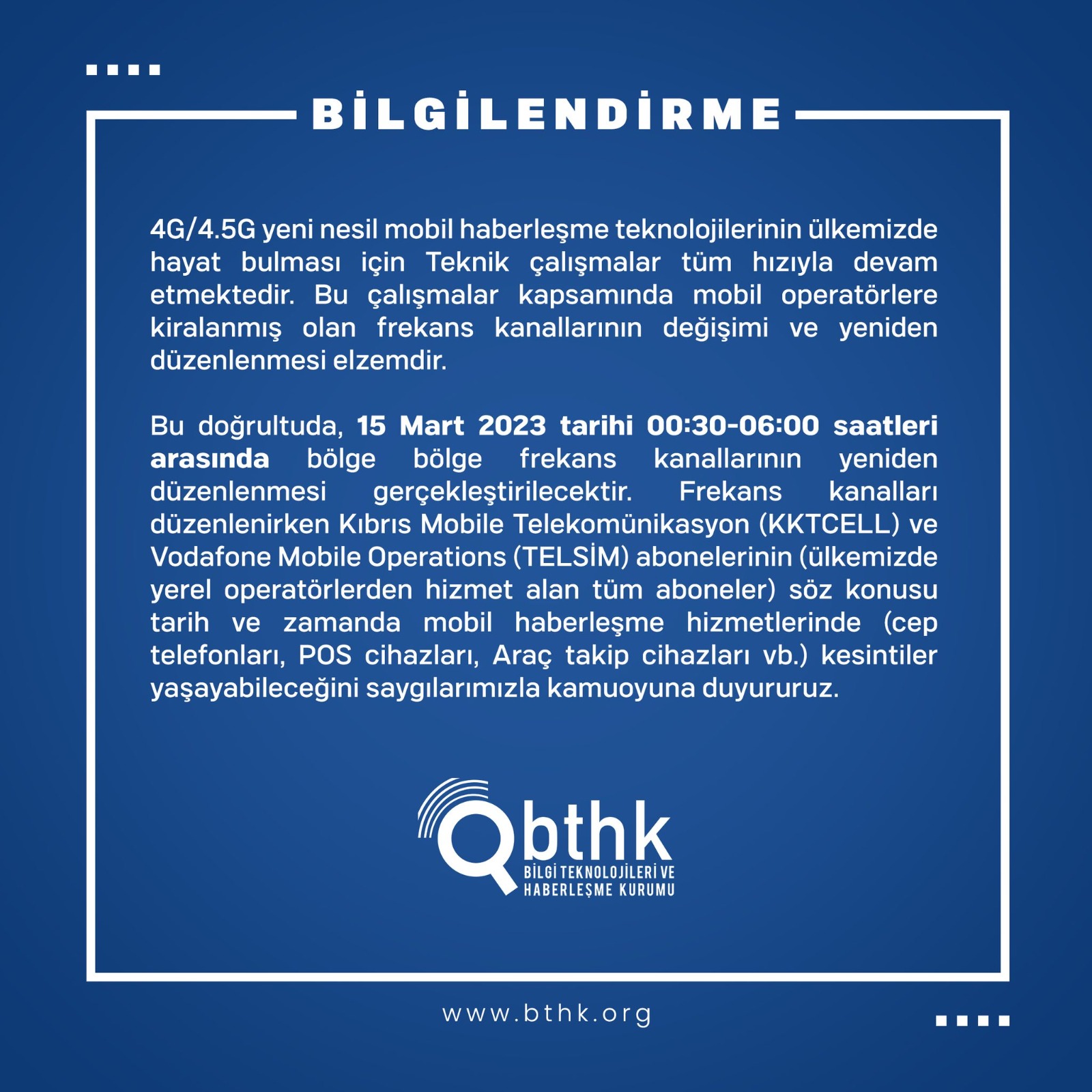 Açıklamada, frekans kanalları düzenlenirken Kıbrıs Mobile Telekomünikasyon (KKTCELL) ve Vodafone Mobile Operations (TELSİM) abonelerinin (ülkede yerel operatörlerden hizmet alan tüm aboneler) söz konusu tarih ve zamanda mobil haberleşme hizmetlerinde (cep telefonları, POS cihazları, araç takip cihazları vb.) kesintiler yaşayabileceği hatırlatıldı.