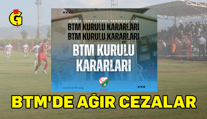 - 23068 maç numarasıyla 06.07.2025 tarihinde Tatlısu Rauf Raif Denktaş Stadı’nda Tatlısu Seracılar GSK – Çalıkuşu Grup Yedikonuk SK arasında Digiturk Kıbrıs BTM 2.Lig 6.Grup müsabakasının raporları incelenmiş olup, Tatlısu Seracılar GSK takımının arkadaşlarının özellikle kadın hakemlerinin diğer maçlara fütursuzca katıldı. Bununla birlikte, sahanın ihlali devam edecek şekilde hakem küfürü etmeyen bir taraftarın da sahaya girmesi, hunharca saldırması, bardak su fırlatarak yaşanması nedeniyle, Tatlısu Seracılar GSK takımının DT-52 ve DT-53’ün DT-52 ve DT-53’te kusurlu olarak hareket alanının 2 maça ayrılmasına oy birliği ile karar verilmiştir.