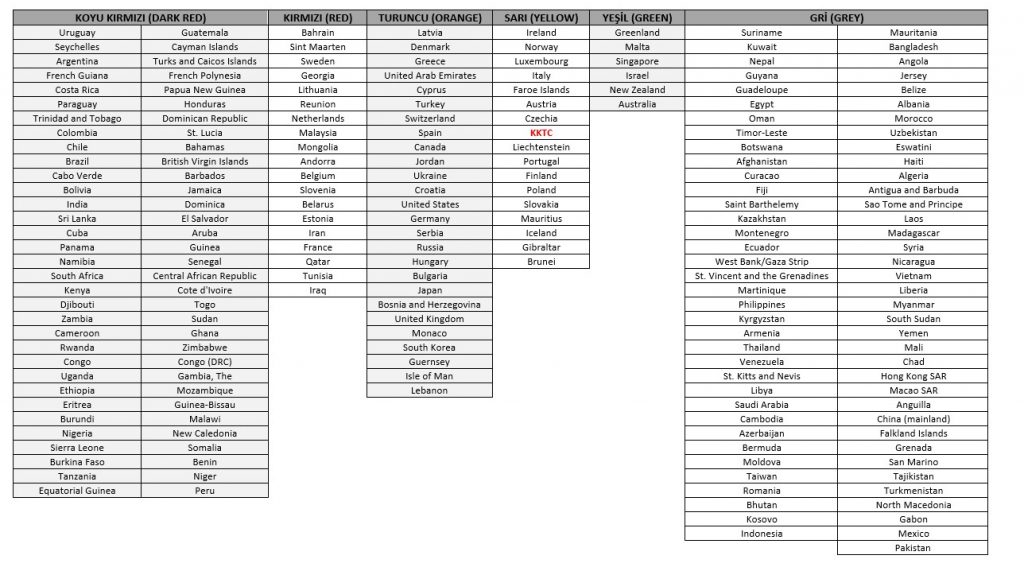 *Yolcular son 14 gün içinde ayak bastıkları/ bulundukları ülkeler arasında en yüksek risk grubundaki ülkeye göre değerlendirileceklerdir.