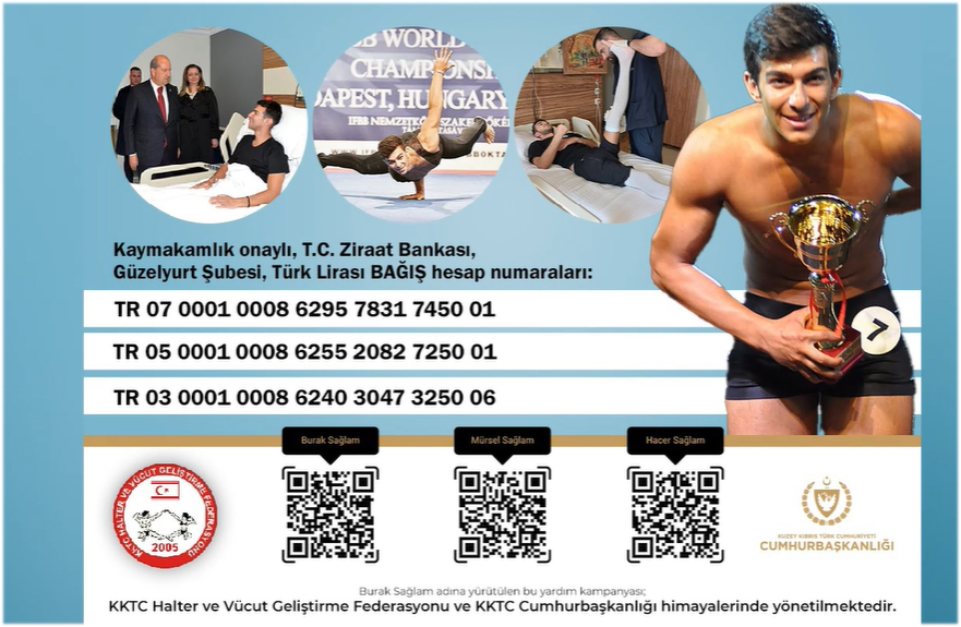 Burak Sağlam adına yürütülen bu yardım kampanyası, KKTC Halter ve Vücut Geliştirme Federasyonu ve KKTC Cumhurbaşkanlığı himayalerinde yönetilmektedir.