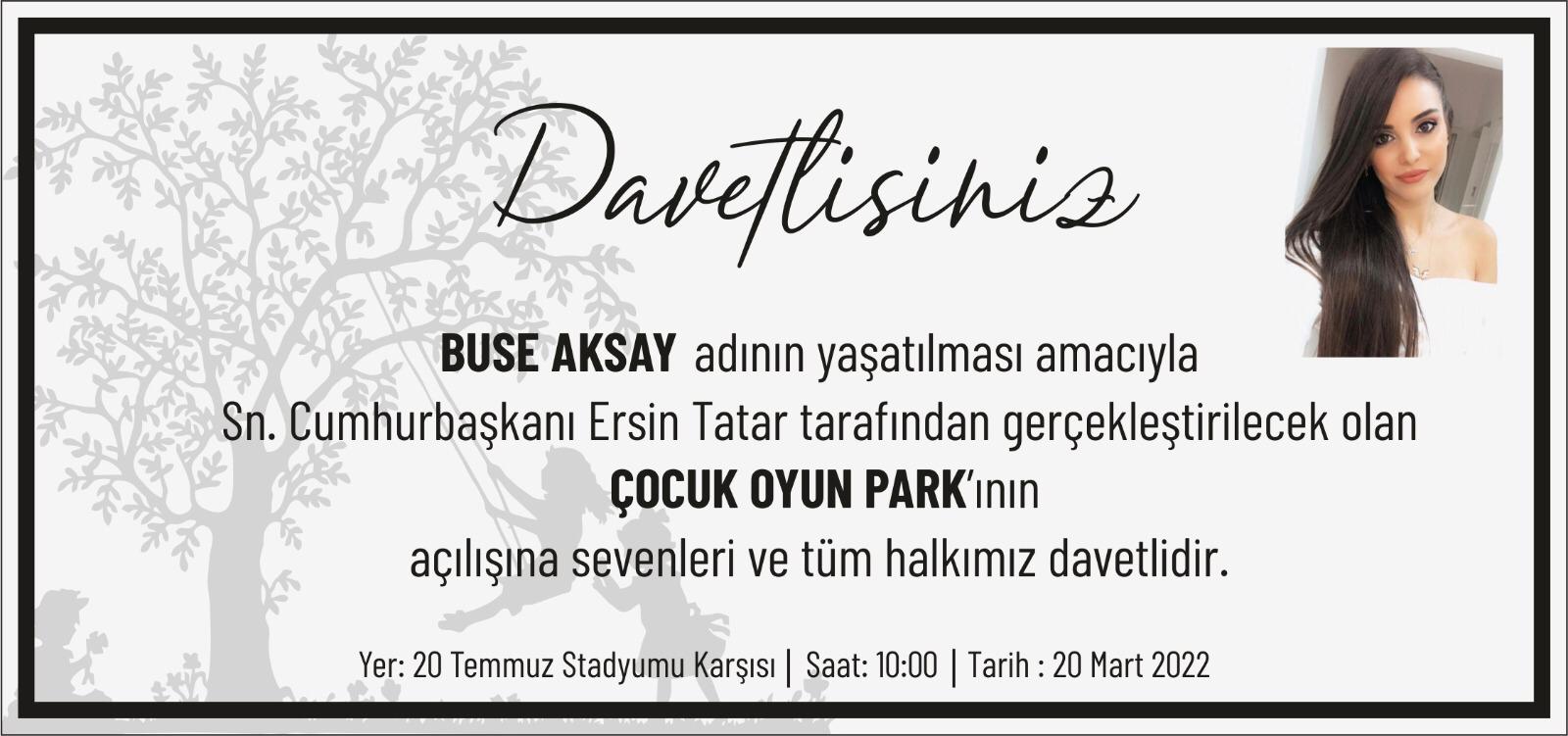Buse Aksay’ın adının yaşatılması amacıyla Cumhurbaşkanı Ersin Tatar tarafından saat 10:00’da gerçekleştirilecek olan Çocuk Oyun Parkı’nın açılışına sevenleri ve tüm halk davet edildi.