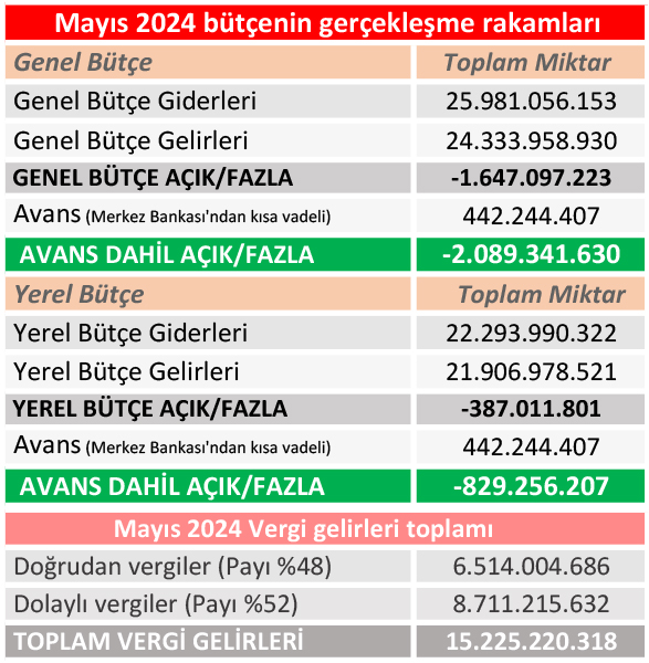 Maliye Bakanlığı’nın verileri Mayıs ayı sonu itibarıyla “genel bütçedeki” açığın 2 milyar 089 milyon TL’nin; “yerel bütçedeki” açığın ise 829 milyon TL’nin üzerine çıktığına işaret ediyor. Mart 2024’te 1 milyar 142 milyon TL “fazla” veren genel bütçede, iki aylık sürede “3 milyar 231,7 milyon TL’lik gerileme” dikkati çekti. 5 aylık dönemde genel bütçe giderleri 25 milyar 981 milyon; genel bütçe gelirleri ise 24 milyar 333 milyon TL düzeyinde kayıtlara geçti. Bu veriler, KKTC Merkez Bankası’ndan alınan 336,7 milyon TL’lik “avans” hariç, genel bütçe açığının 1 milyar 647 milyon TL olduğunu gösteriyor.