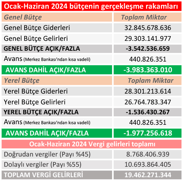 Maliyenin verileri, 2024’ün Ocak-Haziran dönemi itibarıyla yerel bütçede de en yüksek açığa işaret ediyor. Yerel bütçe altı aylık periyotta 26 milyar 764 milyon lira gelir sağlarken, giderler 28 milyar 301 milyon lira oldu. Bu veriler avans hariç açığın 1,5 milyar TL olduğunu gösteriyor. Veriler ayrıca, “TC Yardım ve Kredileri” kaleminin söz konusu dönemde 2 milyar 472 milyon TL olduğunu gösteriyor.