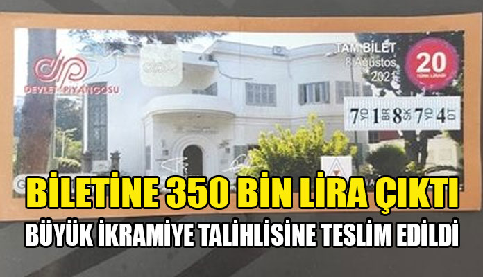 Piyangolar Birimi’nden yapılan açıklamaya göre, Devlet Piyangosu’nun 8 Ağustos tarihli çekilişinde ‘71874’ numaralı bilete isabet eden 350 Bin TL’lik büyük ikramiye bugün, isminin açıklanmasını istemeyen ve Lefkoşa Küçük Kaymaklı’da ikamet eden kişi tarafından daireden teslim alındı.