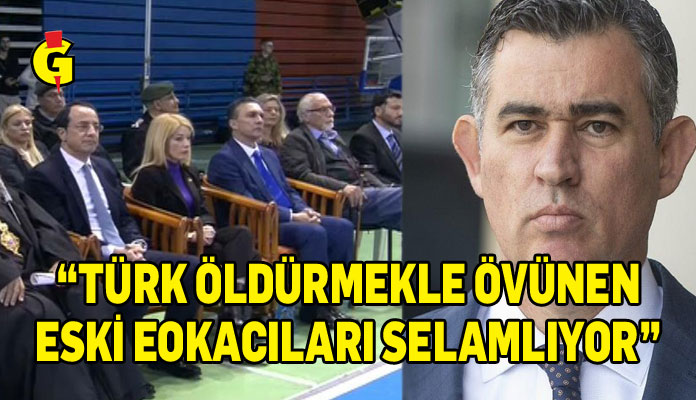 Güney Kıbrıs Rum Yönetimi Başkanı, Türklerden gasp ettikleri Kıbrıs Cumhuriyeti Başkanı sıfatıyla Türklere karşı nice cinayetler işlemiş, soykırım girişimcisi EOKA’nın kuruluş yıldönümünde EOKA pankartı önünde konuşuyor. Türk öldürmekle övünen eski EOKAcıları ve Yunan Bayrağını selamlıyor. Silahlı EOKA paramiliter takımlarının gösterisini alkışlıyor