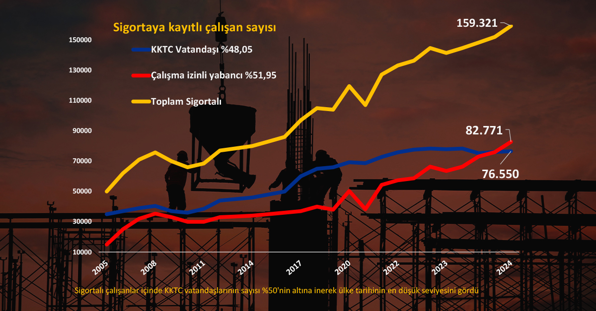 KKTC Merkez Bankası 2024 Dördüncü Çeyrek Raporu’na göre söz konusu dönemde, KKTC vatandaşı sigortalı çalışan sayısı ise sadece 1,354 kişi (%1.75) azalarak 77 bin 904’ten, 76 bin 550’ye düştü. Yeni sigortalı istihdamında yabancı uyrukluların sayısının artarak, yerli çalışanların sayısının 6 bin 221 kişilik fark atması, oldukça dikkat çekici bir nokta olarak kaydedildi. Bu artış, 2022’de TC uyruklu ve üçüncü ülke uyruklu yabancıların toplam sigortalılar içinde %43 olan payının %51.95’e çıkmasını sağladı. Bunun %27.7’lik kısmını TC, %24.2’lik kısmını da üçüncü ülkelerden gelenler oluşturdu. Bu veriler, sadece çalışma izinlileri kapsarken, ülkede 10 binden fazla yabancının da kaçak çalıştırıldığı tahmin ediliyor.