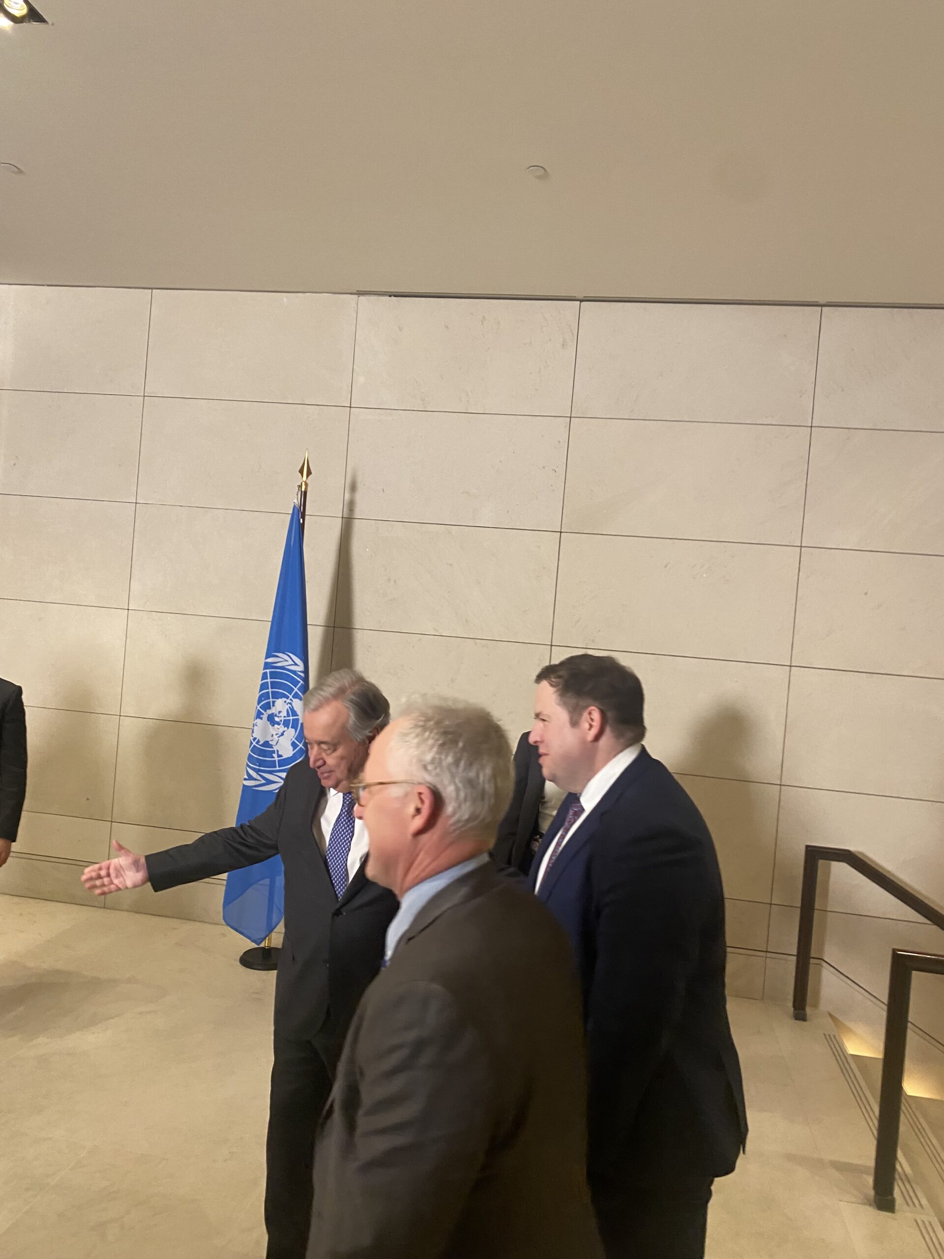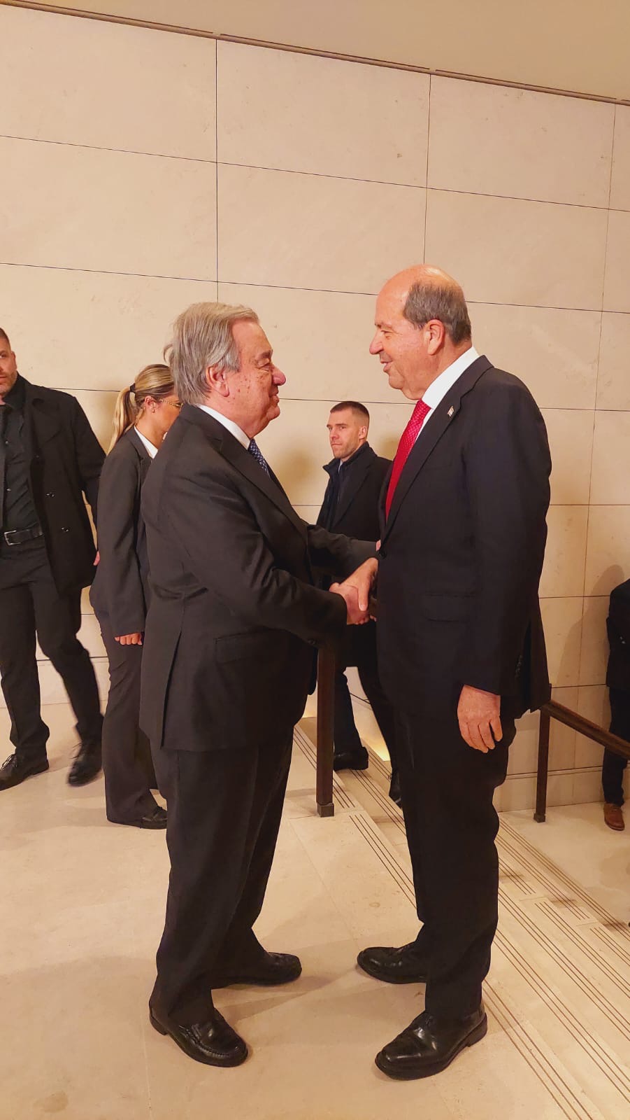 Yemek öncesinde BM Genel Sekreteri, Cumhurbaşkanı Ersin Tatar, Rum Lider Nikos Hristodulidis, Türkiye Dışişleri Bakanı Hakan Fidan, Yunan Dışişleri Bakanı Gerapetritis, İngiltere’nin Avrupa ve Kuzey Amerika’dan Sorumlu Devlet Bakanı Stephen Doughty’yi kapıda karşıladı.