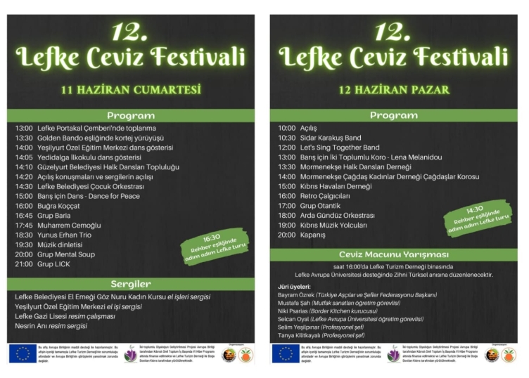 “Bugün 13.00 Lefke Portakal çemberinde toplanma; 13.30 Golden Bando eşliğinde kortej yürüyüşü; 14.00 Yeşilyurt Özel Eğitim Merkezi dans gösterisi; 14.05 Yedidalga İlkokulu dans gösterisi; 14.10 Güzelyurt Belediyesi Halk Dansları Topluluğu; 14.20 Açılış konuşmaları ve sergilerin açılışı; 14.30 Lefke Belediyesi Çocuk Orkestrası; 15.00 Barış için Dans; 16.00 Buğra Koççat; 16.45 Grup Baria; 17.45 Muharrem Cemoğlu; 18.30 Yunus Erhan Trio; 19.30 Müzik dinletisi; 20.00 Grup Mental Soup; 21.00 Grup LICK;