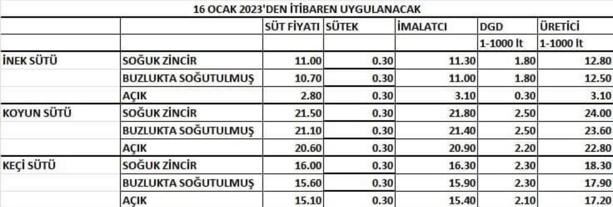 SÜTEK, yeni süt fiyatlarını açıkladı. SÜTEK Yönetim Kurulu’nun aldığı karar doğrultusunda; 16 Ocak 2023 tarihinden itibaren geçerli olacak şekilde “Soğuk Zincir İnek Sütü” imalatçıya litre fiyatı 11,30 TL, “Üretici ödeme fiyatı” litre başına 12,80 TL oldu. Yeni fiyatları gösteren tablo şöyle:
