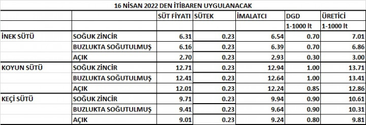Buna göre; Soğuk Zincir İnek Sütü imalatçıya litre fiyatı 7,95 TL, Üretici ödeme fiyatı litre başına 8.40 TL olmuştur.
