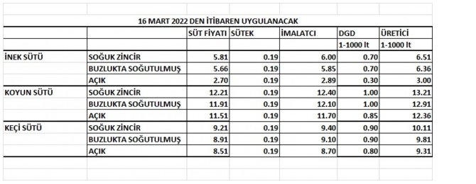 MART AYINDA UYGULANAN ÇİĞ SÜT FİYATLARI