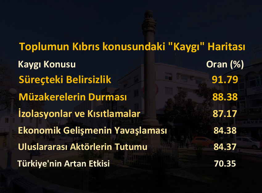 Halkın en büyük kâbusu çözümün olmaması değil, “belirsizlik”. Ankete katılanların %91.79’u mevcut belirsizliği “kaygı verici” buluyor. Mevcut durumun (statükonun) yıllarca değişmeden sürmesi, halkın %81’i için büyük bir endişe kaynağı. Özellikle izolasyonlar ve kısıtlamalar (%87.17) ile ekonomik daralma (%84.38), toplumun geleceğe bakışını karartıyor.