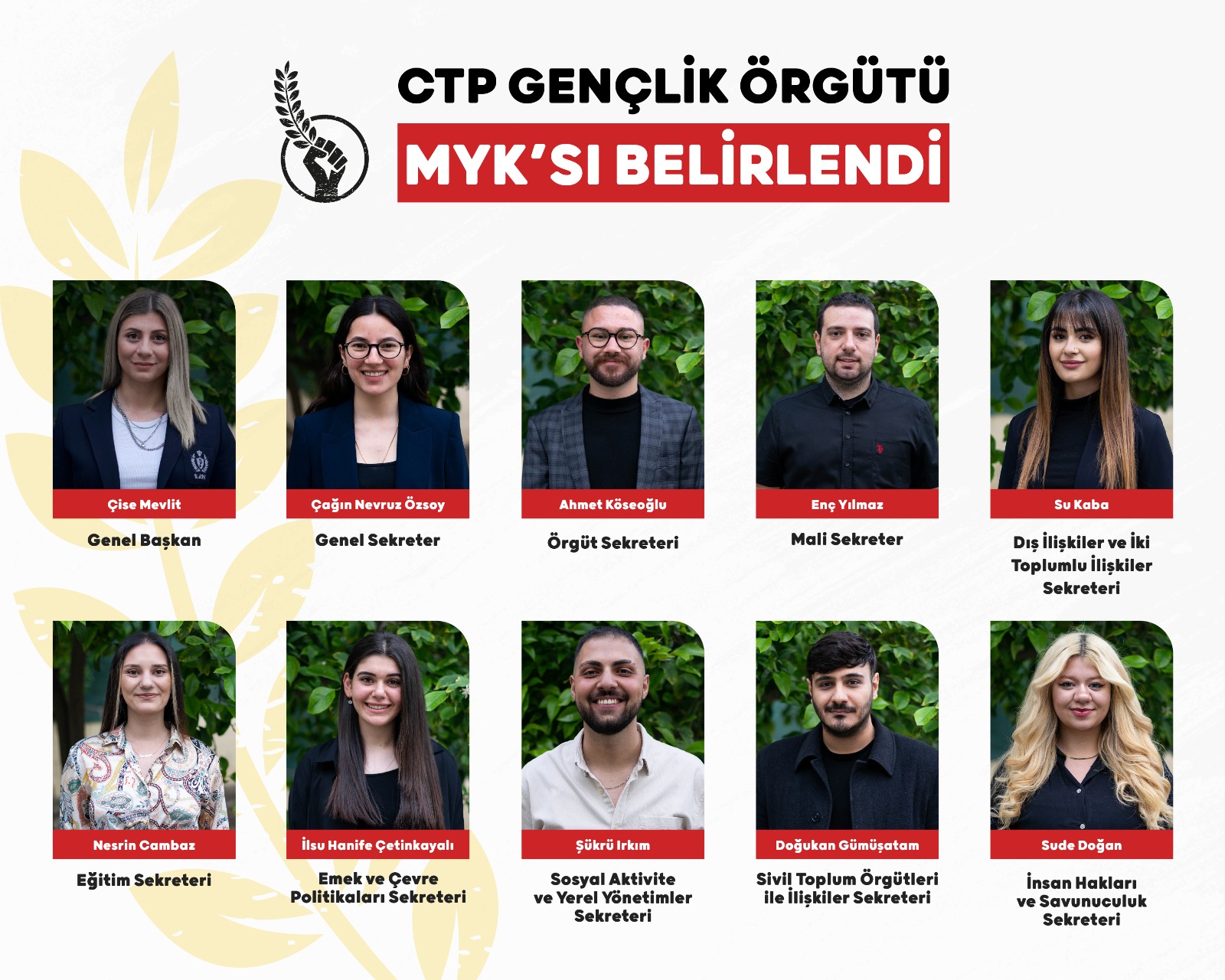 Cumhuriyetçi Türk Partisi (CTP) Gençlik Örgütü, Merkez Yönetim Kurulu (MYK) belirlendi. Geçtiğimiz ay 19’uncu Olağan Kurultayı’nı gerçekleştiren CTP Gençlik Örgütü, MYK’sını da belirledi. Gençlik Meclisi’nde MYK’ya girecek isimler onaylanırken, MYK da yaptığı ilk toplantısında görev dağılımını gerçekleştirdi. Çise Mevlit Başkanlığı’ndaki Gençlik Örgütü MYK’sı şu isimlerden oluştu: