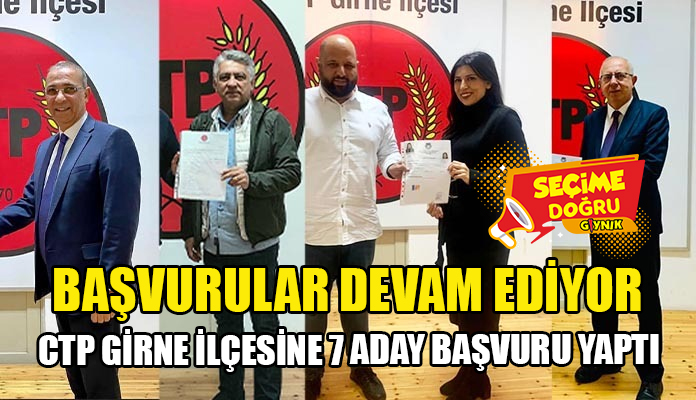 Girne İlçesi’nde CTP Girne milletvekilleri Fikri Toros ve Fazilet Özdenefe’nin yanı sıra Girne Akçiçek Hastanesi Eski Başhekimi Dr. Ceyhun Birinci, Eğitim Bilimci Salih Sarpten, uzman psikolog Pembe Ardıç, Kıbrıs Türk Esnaf ve Zanaatkarlar Odası başkanı Mahmut Kanber ile İş Geliştirme ve Ekonomik Kalkınma Uzmanı Niyal Öztürk Cumhuriyetçi Türk Partisi’nde Girne İlçesi’nde milletvekilliği adaylık başvurularını yaptı.