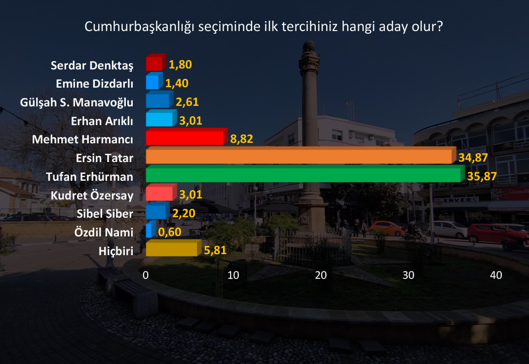 Cumhurbaşkanlığı seçiminde ilk tercihleri sorulan vatandaşların %35.8’i Erhürman’ı, %34.8’i ise Tatar’ı işaret etti