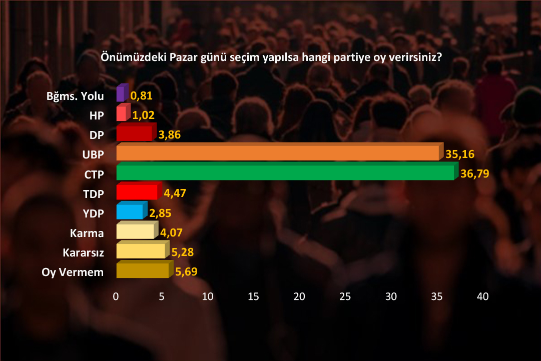 CMIRS’in 500 kişi ile yüz yüze yaptığı anketten çıkan sonuç, Ulusal Birlik Partisi’nin tüm iç kavgalara ve çekişmelere rağmen hala çok güçlü olduğunu da gösteriyor. Katılımcıların %35.16’sı UBP’yi destekleyeceğini açıkça beyan ederken, CTP destekçileri %36.79 ile öne çıktı. Toplumcu Demokrasi Partisi’nin %4.47 ile üçüncü sıraya yerleştiği ankette, “karma oy” kullanacağını söyleyen %5.69’luk kesim, iki büyük partinin ardından geliyor. Oy kullanmayacağını söyleyenlerin oranının %5’lik barajın üstüne çıktığı ankette, iki parti dışındaki diğer partilerin baraj sıkıntısı yaşayabileceği dikkati çekiyor.