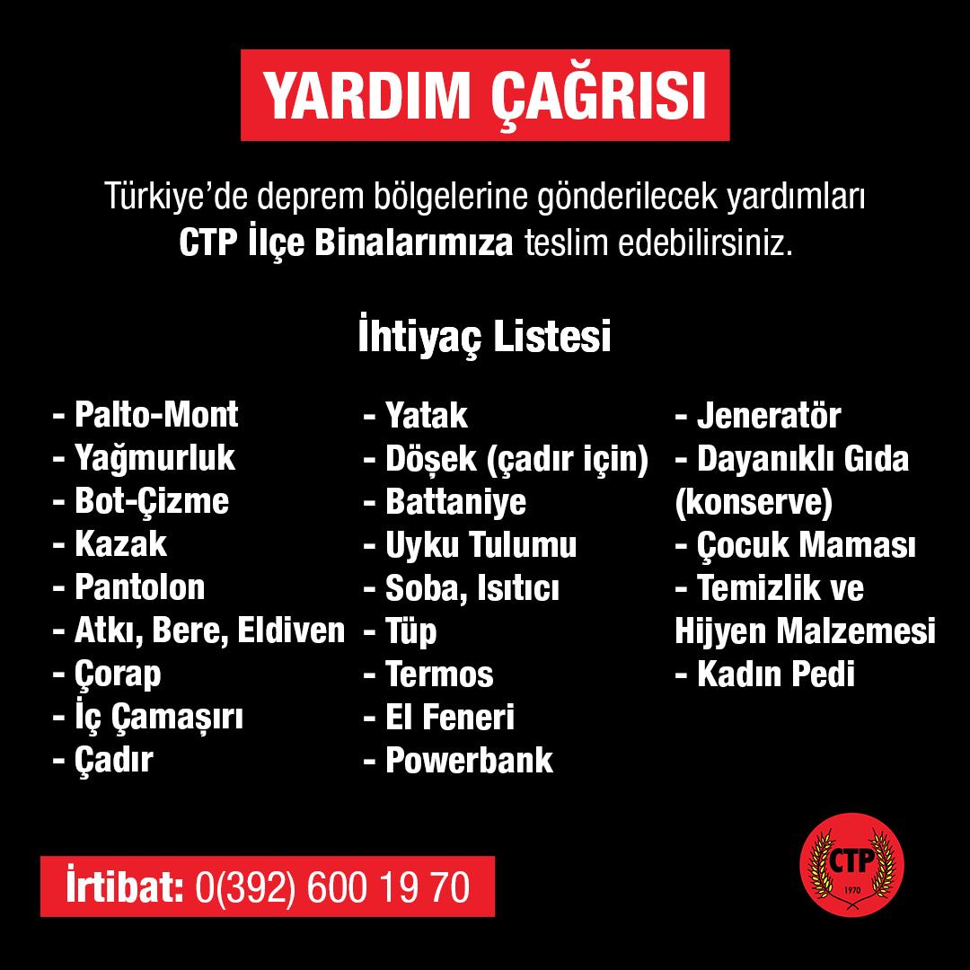 Cumhuriyetçi Türk Partisi (CTP), Türkiye’nin Güneydoğusunda meydana gelen yıkıcı depremden etkilenen bölgeler için yardım kampanyası başlattığını duyurdu