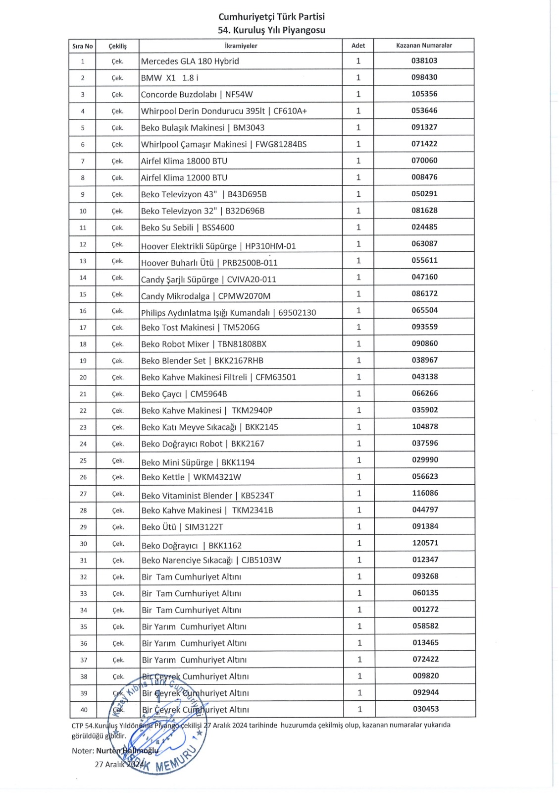 Çekilişin iki büyük ikramiyesi olan BMW X1 1.8i model araç 098430 numaralı bilete, Mercedes GLA180 hybrid model araç ise 038103 numaralı bilete isabet etti.