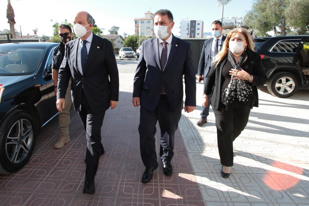 Cumhurbaşkanı Tatar’a basın açıklaması sırasında Başbakan Ersan Saner eşlik etti. Açıklamanın ardından Tatar’ı uğurlayan Başbakan Saner de basına açıklama yaptı.
