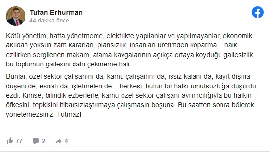 Erhürman, “Kötü yönetim, hatta yönetmeme, elektrikte yapılanlar ve yapılmayanlar, ekonomik akıldan yoksun zam kararları, plansızlık, insanları üretimden koparma… halk ezilirken sergilenen makam, atama kavgalarının açıkça ortaya koyduğu gailesizlik, bu toplumun gailesini dahi çekmeme hali…” ifadelerini kullandı.